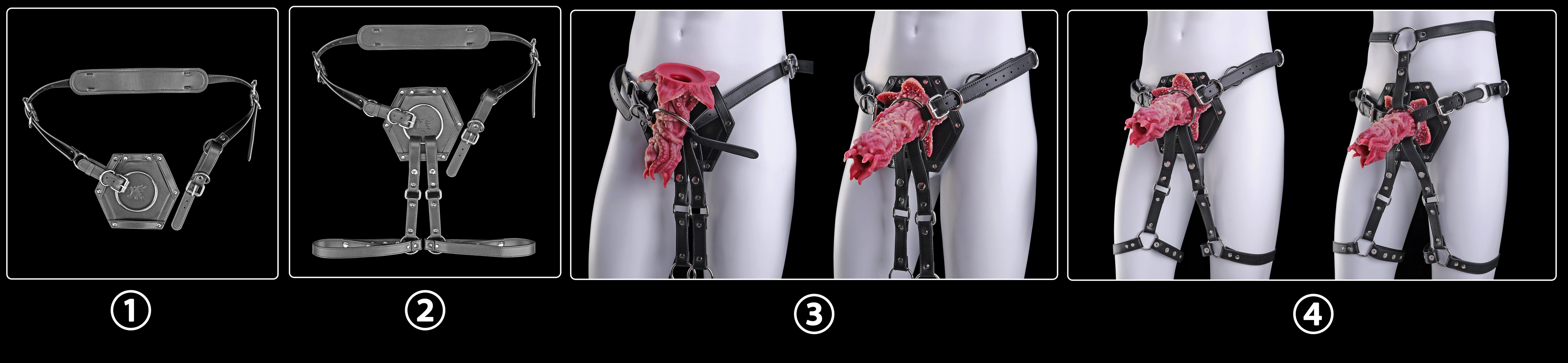 ③Put on the Waist Strap, place the toy into the ring, then thread the other Connect Padding Strap (the one not yet attached to the padding) through the padding and ring, and tighten it.